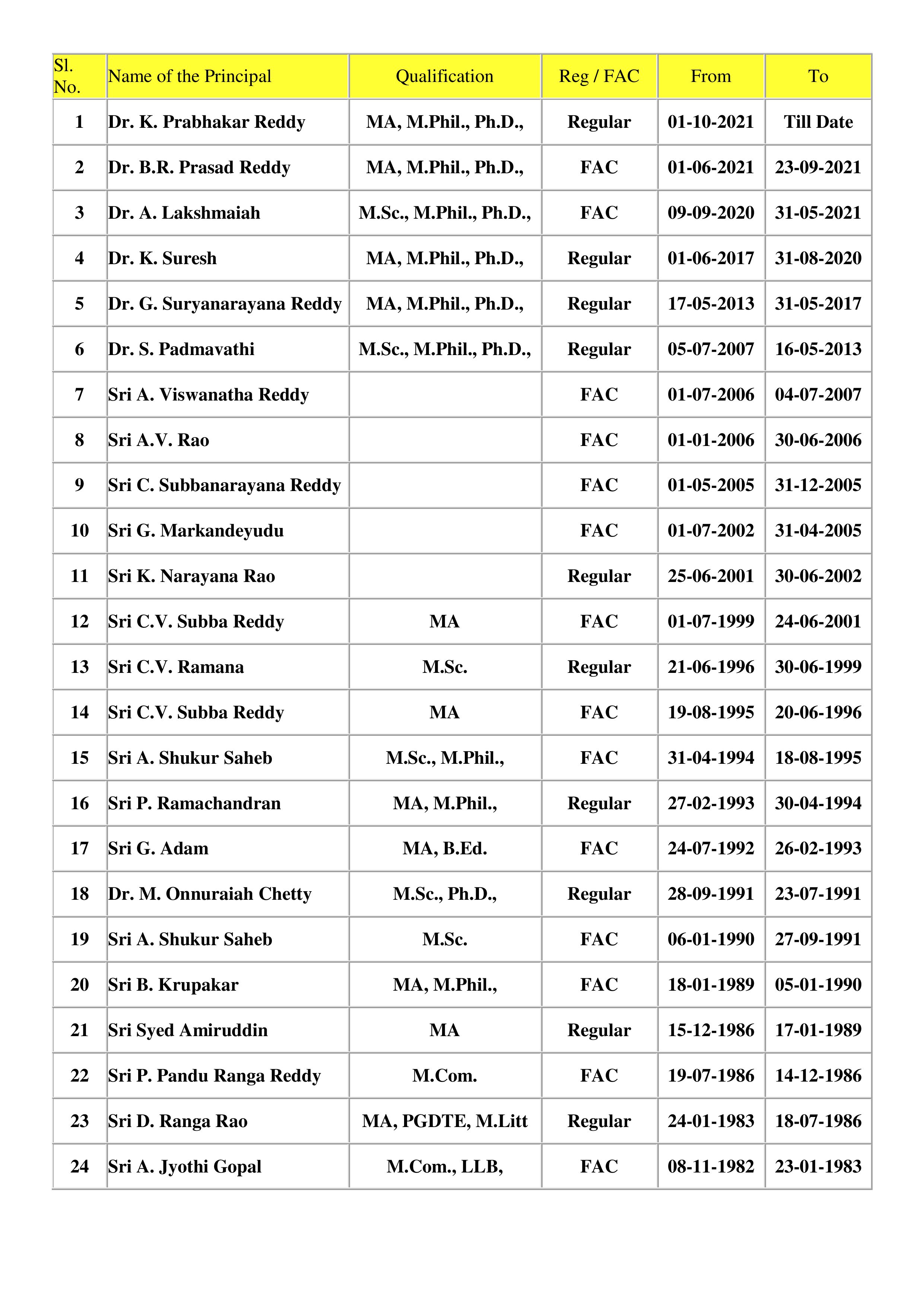Succession List of Principals :
